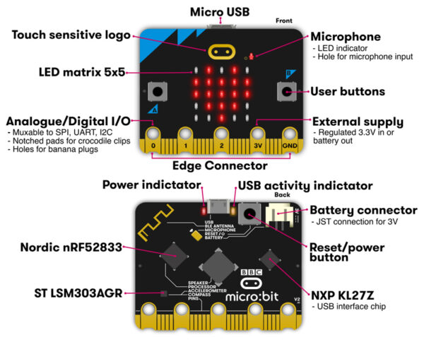 Αποτελείται από ενσωματωμένο Bluetooth, accelerometer, ηλεκτρονική πυξίδα, τρία κουμπιά, 5 x 5 LED dot matrix.