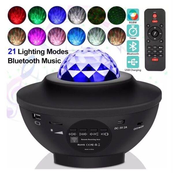 Το Led περιστρεφόμενο φωτιστικό projector με ήχο διαθέτει τηλεκοντρόλ προκειμένου να μπορείτε να χειρίζεστε από απόσταση τα φωτορυθμικά. Ακόμα μπορείτε να ρυθμίσετε το χρώμα που θέλετε να έχει η λάμπα ανάλογα με τις ανάγκες σας. Η λάμπα είναι ικανή να φωτίσει με φανταστικά εφέ επαρκώς ένα χώρο. Διαθέτει σύνδεση bluetooth που αλλάζει τα χρώματα και παίζει μουσική, έχει χειριστήριο με 21 πλήκτρα διαφορετικών λειτουργιών. Μπαταρία 1000mAh. Ισχύς 6W.
