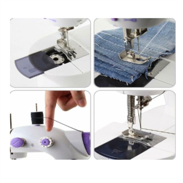 Mini φορητή ραπτομηχανή. Δύο ταχύτητες ραφής και ρύθμιση τάσης νήματος. Μέγιστο πάχος ραφής 10χιλ. Διαστάσεις 19×9,5x18cm.