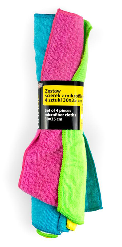 Σετ πανάκια καθαρισμού της Moje Auto, κατασκευασμένα από μαλακό υλικό μικροϊνών. Απορροφούν το νερό και αφαιρούν την σκόνη από τις επιφάνειες του αυτοκινήτου, χωρίς να αφήνουν γρατζουνιές. Το σετ περιλαμβάνει 4 πανάκια σε κίτρινο, μπλε, ροζ και πράσινο χρώμα.