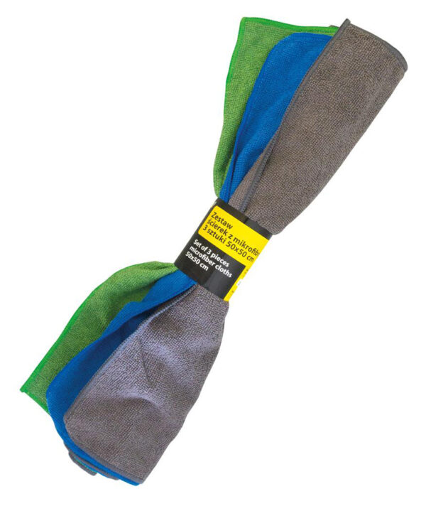 Σετ πανάκια καθαρισμού της Moje Auto, κατασκευασμένα από μαλακό υλικό μικροϊνών. Απορροφούν το νερό και αφαιρούν την σκόνη από τις επιφάνειες του αυτοκινήτου, χωρίς να αφήνουν γρατζουνιές. Το σετ περιλαμβάνει 3 πανάκια σε γκρι, μπλε και πράσινο χρώμα.