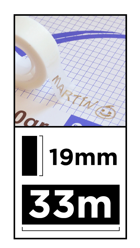 Διάφανη κολλητική ταινία με πλάτος 19 χιλιοστά και δυνατότητα γραφής με στυλό, μολύβι ή μαρκαδόρο. Είναι σχεδόν αόρατη για να επιδιορθώνει διακριτικά και δεν εμφανίζεται στα φωτοαντίγραφα. Αφαιρείται εύκολα από οποιαδήποτε στέρεα επιφάνεια, χωρίς να αφήνει κατάλοιπα.