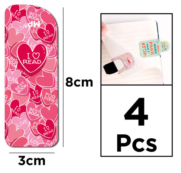 Μαγνητικοί σελιδοδείκτες με σχέδια "I love reading", ιδιαίτερα πρακτικοί, για παιδιά και ενήλικες. Η συσκευασία περιλαμβάνει 4 σελιδοδείκτες.