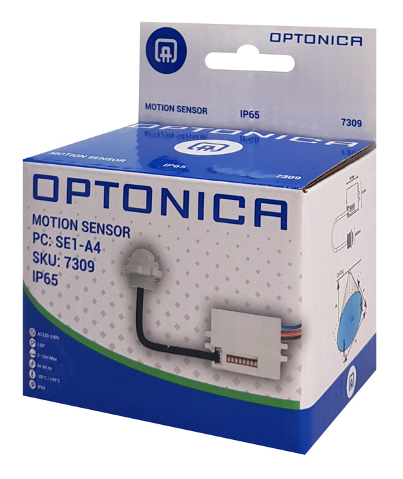 Αισθητήρας κίνησης PIR της Optonica, ειδικά σχεδιασμένος για χρήση με λάμπες LED. Εντοπίζει κίνηση με ανίχνευση σε γωνία 120° και εμβέλεια έως 6m. Είναι κατασκευασμένος από ανθεκτικό πλαστικό και αλουμίνιο με προστασία IP65.