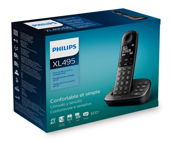 Απολαύστε την απλότητα του ασύρματου τηλεφώνου XL495 της Philips. Διαθέτει εξαιρετικά μεγάλη οθόνη και πλήκτρα, άνετη συσκευή χειρός και χρήσιμες λειτουργίες, όπως τηλεφωνητή, ενίσχυση έντασης, συμβατότητα με ακουστικά βαρηκοΐας και πολλές καταχωρήσεις τηλεφωνικού καταλόγου.