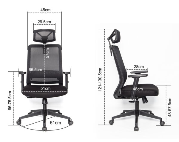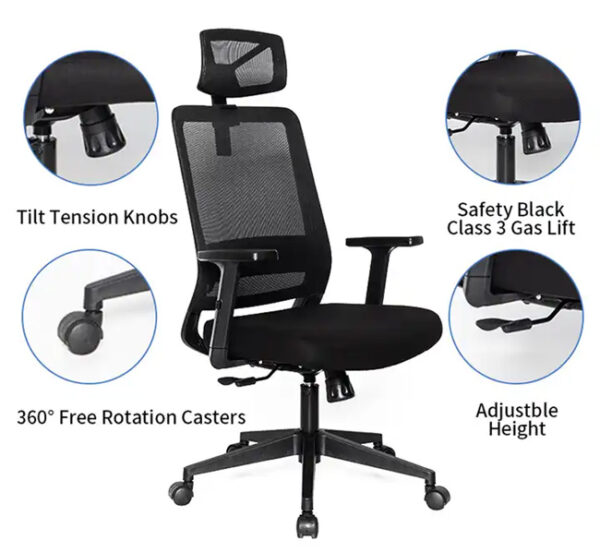 Εργονομική καρέκλα γραφείου, επενδυμένη από διάτρητο ύφασμα mesh το οποίο προσφέρει σωστή στήριξη και κυκλοφορία του αέρα, αποτρέποντας την εφίδρωση του σώματος. Εξοπλίζεται με ροδάκια για εύκολη μετακίνηση και ρυθμιζόμενα μπράτσα για την στήριξη των χεριών. Επιπλέον, διαθέτει λειτουργία ανάκλισης και περιστροφής αλλά και μηχανισμό ρύθμισης ύψους. Προσφέρει αναπαυτική εργασία και όμορφη εμφάνιση.