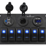 Πάνελ της Powertech, κατάλληλο για τοποθέτηση σε σκάφη και οχήματα όπως τρακτέρ κ.α. Εξοπλίζεται με υποδοχή αναπτήρα 12V, 2x θύρες φόρτισης USB και 6x φωτιζόμενους διακόπτες για σύνδεση με φώτα, κόρνα, υαλοκαθαριστήρες κ.λπ.