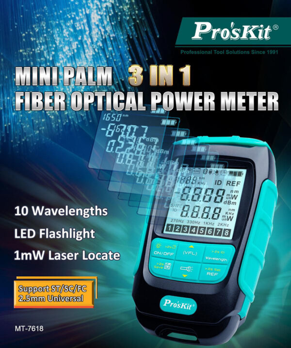 Το MT-7618 από την PROSKIT είναι ένα μίνι πολύμετρο για την μέτρηση ισχύος και την ανίχνευση θέσης οπτικού σφάλματος σε οπτικές ίνες.