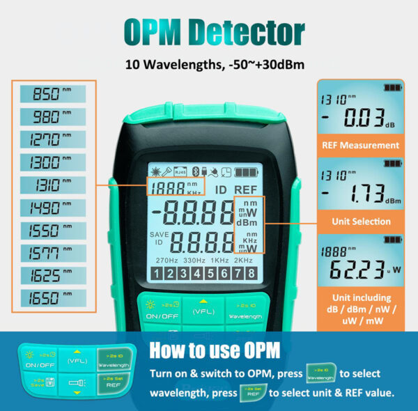 -Measuring wavelength: 850/980/1270/1300/1310/1490/1550/1577/1625/1650nm