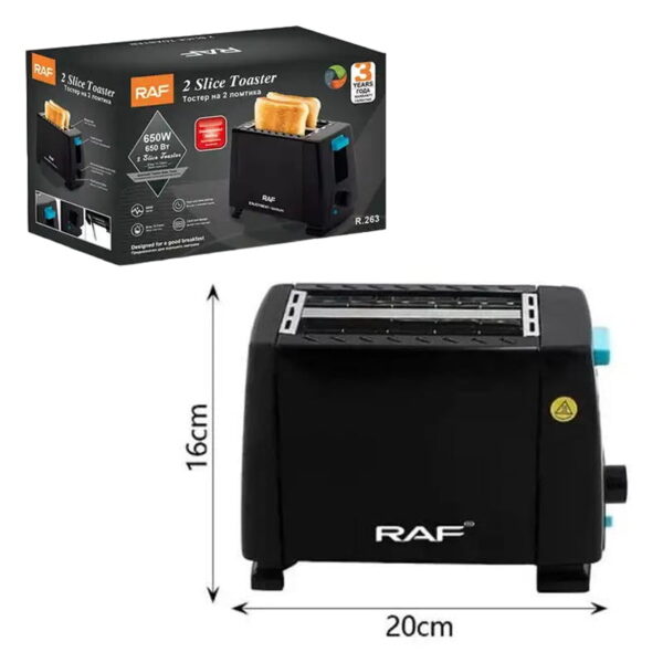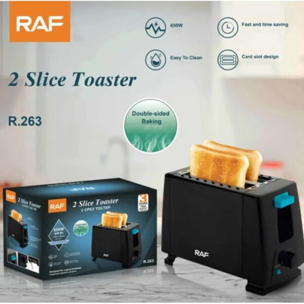 Η φρυγανιέρα Raf R.263 διαθέτει ισχύ 650 Watt και υποδοχές για 2 φέτες ψωμιού. Μπορεί να εξυπηρετήσει τις ανάγκες ενός ή και δύο ατόμων για την καθημερινή παρασκευή του πρωινού ή του σνακ.