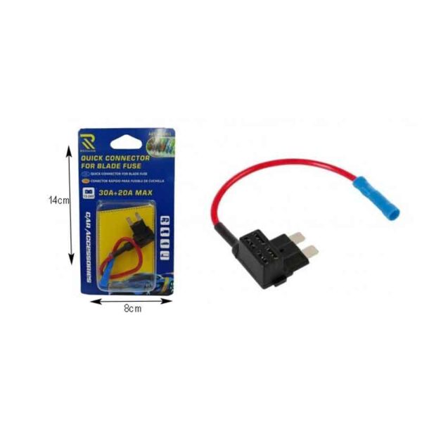 Γρήγορος σύνδεσμος για ασφάλειες τύπου λεπίδας, ιδανικός για προσθήκη επιπλέον κυκλώματος χωρίς κοπή καλωδίων. Κατάλληλος για συστήματα 12V, με μέγιστο φορτίο 30A + 20A. Περιλαμβάνει έτοιμο καλώδιο και ακροδέκτη για εύκολη εγκατάσταση. Ιδανικός για χρήση σε αυτοκίνητα, φορτηγά, μοτοσυκλέτες και άλλα οχήματα. Συσκευασία blister 8×14 εκ.