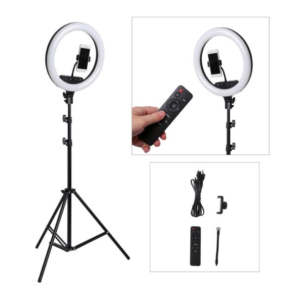 Ring fill light 14" ιντσών led. Ιδανικό για φωτογραφίσεις και video. Περιλαμβάνει βάση για κινητό. Διαστάσεις 35×3.7x35cm. Περιλαμβάνει τρίποδο και χειριστήριο.