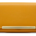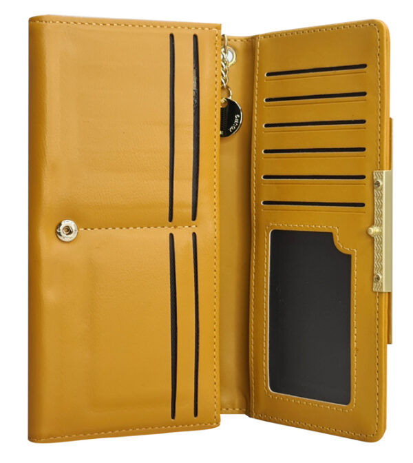 Κομψό, υψηλής ποιότητας γυναικείο πορτοφόλι σε κίτρινο χρώμα με χρυσές λεπτομέρειες. Διαθέτει πολλαπλές θέσεις στο εσωτερικό του για χαρτονομίσματα, 2 μέρη με φερμουάρ για ψιλά και 14 θέσεις για κάρτες.