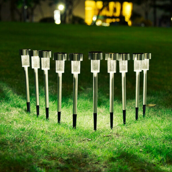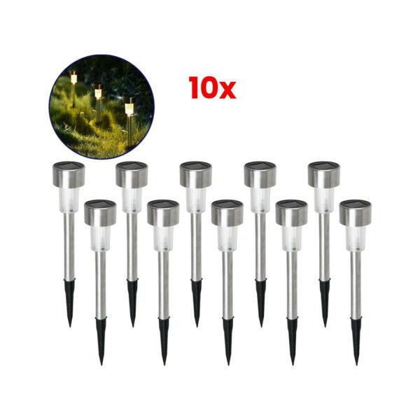 Σετ καρφωτών ηλιακών φωτιστικών σε ασημί χρώμα, που συγκεντρώνουν και αποθηκεύουν ηλιακή ενέργεια για τη λειτουργία τους, ώστε να μη χρειάζεται να συνδεθούν σε παροχή ρεύματος. Διαθέτει ανιχνευτή κίνησης για να ενεργοποιείται όταν εντοπίσει κίνηση εντός της εμβέλειάς του, αλλά και αισθητήρα φωτός για να ενεργοποιείται αυτόματα κατά τη δύση του ηλίου.