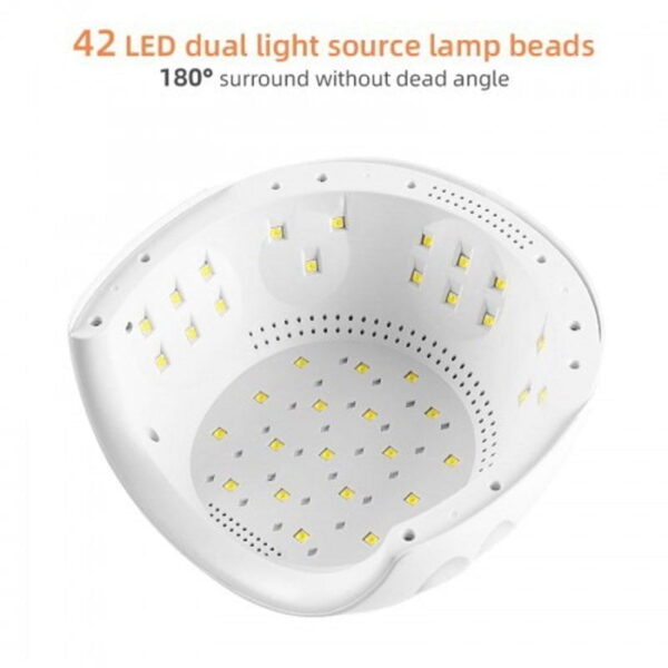 Το επαγγελματικό φουρνάκι νυχιών M5 PLUS SOGENI περιέχει 42 led, κατανεμημένα πάνω στο σκελετό έτσι ώστε να μην υπάρχουν νεκρές ζώνες. Με αυτό τον τρόπο εξασφαλίζεται η μέγιστη απόδοση, χωρίς απώλειες στον πολυμερισμό.