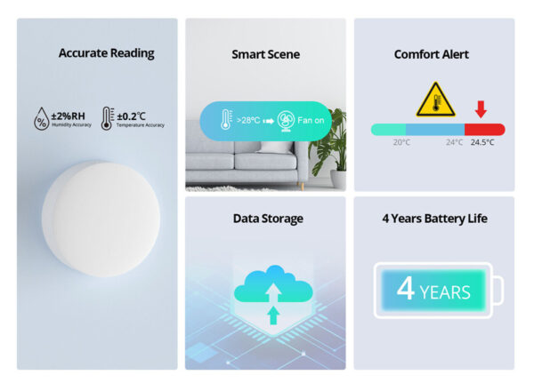 Υποστηρίζει πρωτόκολλο σύνδεσης ZigBee 3.0 και είναι συμβατό με τα hubs ZigBee Bridge/Pro, NSPanel Pro, SmartThings hub V3, AeoTec Smart Home hub V3, ZBDongle-P/E, Echo 4th Gen κ.α.