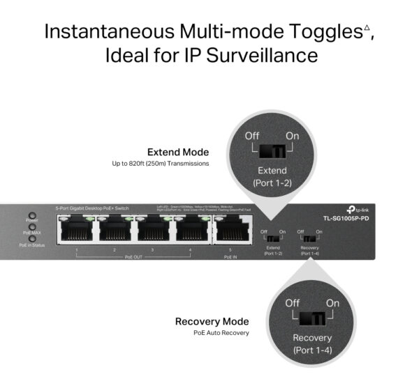 Extend Mode Button (Ports 1–2, Up to 250 m PoE power supply and data transmission)