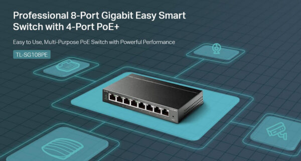 Το TL-SG108PE είναι ένα επαγγελματικό Gigabit Easy Smart Switch 8-θυρών με PoE 4 θυρών, πλήρως συμβατό με συσκευές PoE, όπως κάμερες IP, σημεία πρόσβασης και τηλέφωνα IP. Λειτουργεί επίσης με ενσύρματες συσκευές εκτός PoE, όπως υπολογιστές, εκτυπωτές και IPTV.