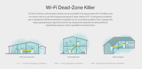 -Το Deco E4 παρέχει γρήγορες και σταθερές συνδέσεις με ταχύτητες έως 1167 Mbps και συνεργάζεται με τον κύριο πάροχο υπηρεσιών διαδικτύου (ISP) και μόντεμ.