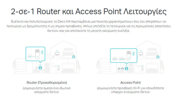 -Με την προηγμένη τεχνολογία Deco Mesh, οι μονάδες συνεργάζονται για να σχηματίσουν ένα ενοποιημένο δίκτυο με ένα μόνο όνομα δικτύου. Οι συσκευές αλλάζουν αυτόματα μεταξύ Decos καθώς μετακινείστε στο σπίτι σας για τις γρηγορότερες δυνατές ταχύτητες.
