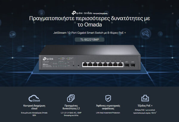 Το TL-SG2210MP είναι ένα switch επαγγελματικών προδιαγραφών που εξοπλίζεται με 8 θύρες δικτύου PoE+ και 2 θύρες SFP με ταχύτητες 10/100/1000Mbps.