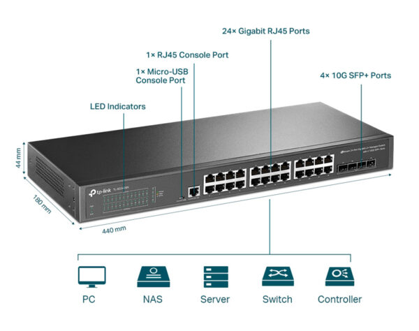 Το TL-SG3428X είναι ένα switch επαγγελματικών προδιαγραφών που εξοπλίζεται με 24 θύρες δικτύου 10/100/1000Mbps και 4 θύρες SFP+ 10Gbps.
