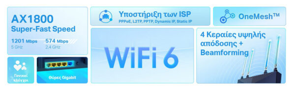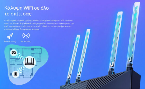 -Ευρύτερη κάλυψη – Ο βελτιωμένος αλγόριθμος, η διαμόρφωση δέσμης και οι κεραίες υψηλής απόδοσης βελτιώνουν την απόδοση κάλυψης Wi-Fi.