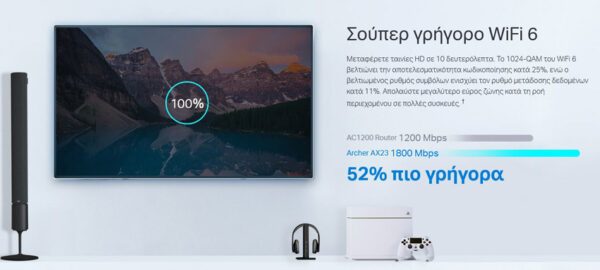 Το Archer AX23 χάρη στο τελευταίας γενιάς WiFi 6, προσφέρει γρηγορότερες ταχύτητες, λιγότερη καθυστέρηση και υψηλότερη χωρητικότητα, επιτρέποντας ταυτόχρονες συνδέσεις στο οικιακό σας δίκτυο. Ολοκληρώστε απλές εργασίες, όπως αποστολή e-mail ή περιήγηση στο internet στη ζώνη 2.4 GHz με ταχύτητες έως 574 Mbps και πιο απαιτητικές εργασίες, όπως διαδικτυακά παιχνίδια ή παρακολούθηση ταινιών στη ζώνη 5 GHz με ταχύτητες έως 1201 Mbps, ταυτόχρονα και χωρίς καθυστέρηση.