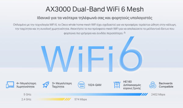 -AX3000 Dual-Band Wi-Fi 6- Απολαύστε την παρακολούθηση της αγαπημένης σας σειράς σε 4K με συνδυαστικές ταχύτητες έως και 3000 Mbps (574 Mbps στα 2,4 GHz και 2402 Mbps στα 5 GHz)