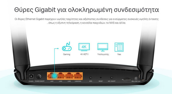-Θύρες Full Gigabit – παρέχει αξιόπιστες ενσύρματες συνδέσεις για συσκευές υψηλής έντασης εύρους ζώνης, όπως κονσόλες παιχνιδιών και STB
