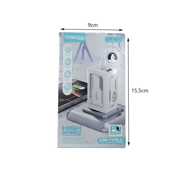 Treqa Φορτιστής και Καλώδιο Φόρτισης USB + Type-C PD 65W – Διπλή Γραμμή & Ταχεία Φόρτιση TR-653 – Fast Charger
