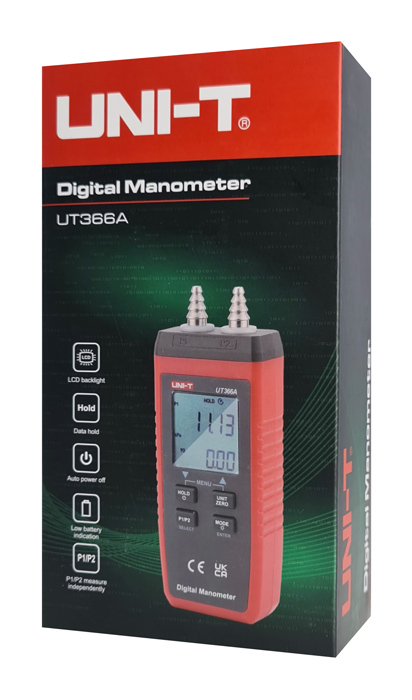 Το UT366A είναι ένα όργανο για την μέτρηση της μανομετρικής πίεσης και της διαφορικής πίεσης. Μπορεί να μετρήσει ανεξάρτητα την πίεση PI/P2, και παρουσιάζει την πίεση με LED ένδειξη πράσινου χρώματος, σε περίπτωση που είναι θετική, και κόκκινου χρώματος, σε περίπτωση που είναι αρνητική.