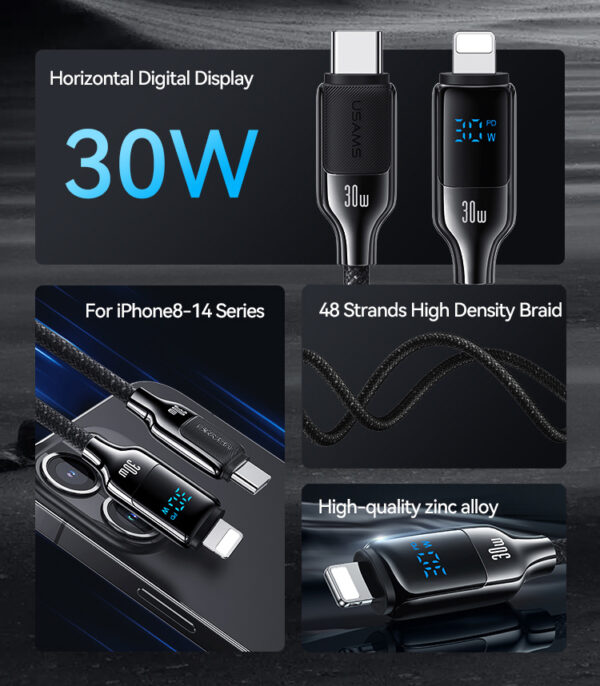 Καλώδιο φόρτισης και μεταφοράς δεδομένων Lightning σε USB-C της Usams. Υποστηρίζει φόρτιση με απόδοση έως 30W και μεταφορά δεδομένων με ταχύτητα έως 480Mbps.