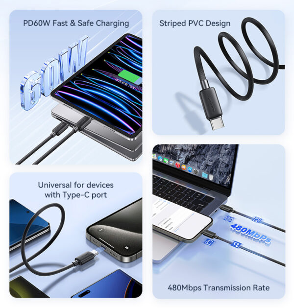 Καλώδιο φόρτισης και μεταφοράς δεδομένων USB-C σε USB-C της Usams. Υποστηρίζει φόρτιση με απόδοση έως 60W και μεταφορά δεδομένων με ταχύτητα έως 480Mbps.