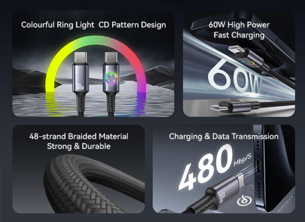 Καλώδιο φόρτισης και μεταφοράς δεδομένων USB-C σε USB-C της Usams. Υποστηρίζει φόρτιση με απόδοση έως 60W και μεταφορά δεδομένων με ταχύτητα έως 480Mbps.